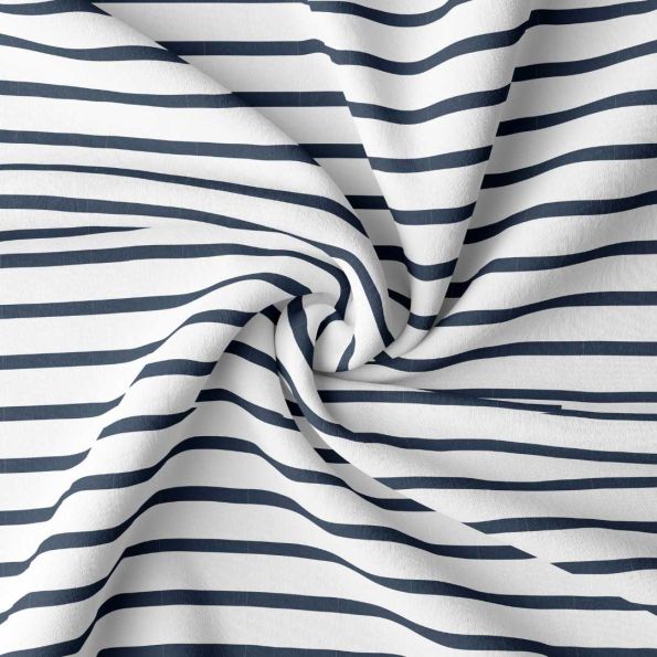Ce jersey coton rayé marine sur fond blanc est un tissu doux avec un toucher souple, facile d'entretien. Les fils sont teints avant le tricotage permettent une meilleure tenue des couleurs au lavage. Il est préférable de le laver à basse température et de le laisser sécher à l'air libre. Le repassage est possible à température moyenne. Nous vous conseillons de laver le tissu une première fois avant de le couper. Il sera idéal pour créer des vêtements fluides tels que des robes, des jupes, des pulls fins, t-shirt, etc...
