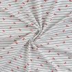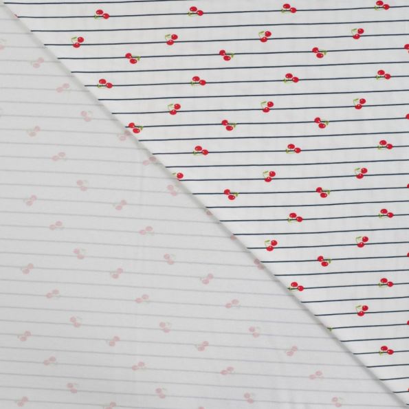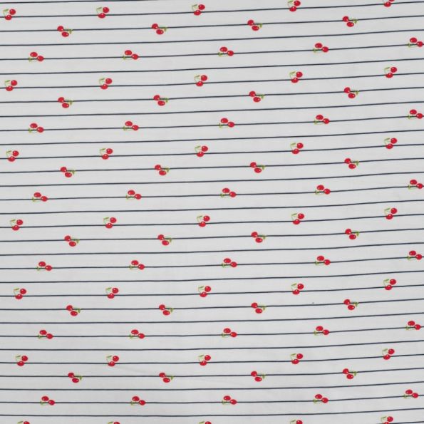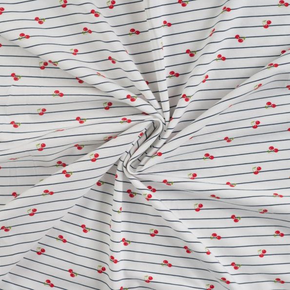 Tissu Jersey Coton Rayures bleues et cerises sur fond Blanc - Par 10 cm