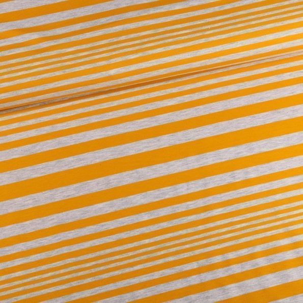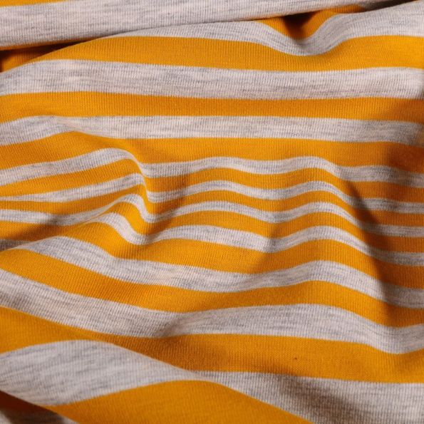 Tissu Jersey coton Rayures jaunes sur fond Gris chiné - Par 10 cm