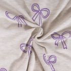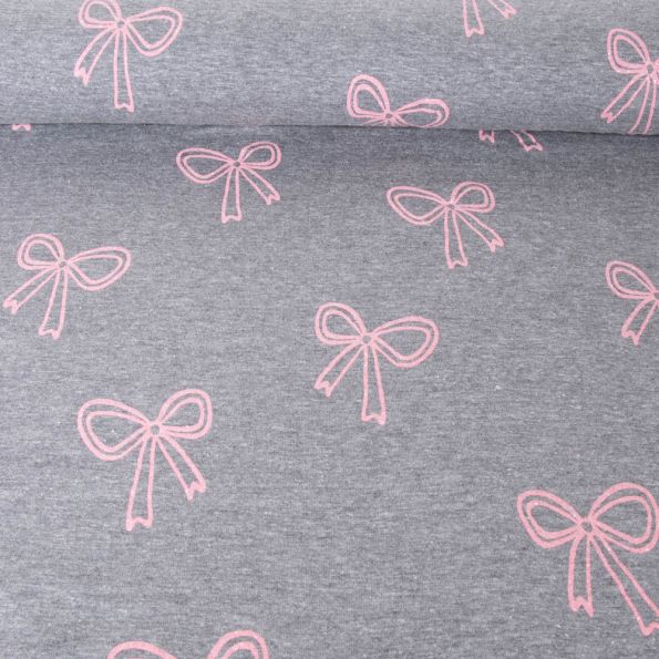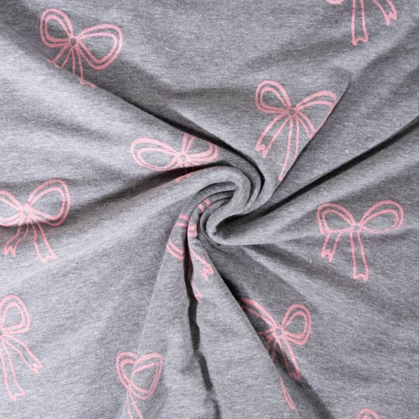 Tissu Jersey Mélangé Poppy Noeuds pailletés roses sur fond Gris chiné - Par 10 cm