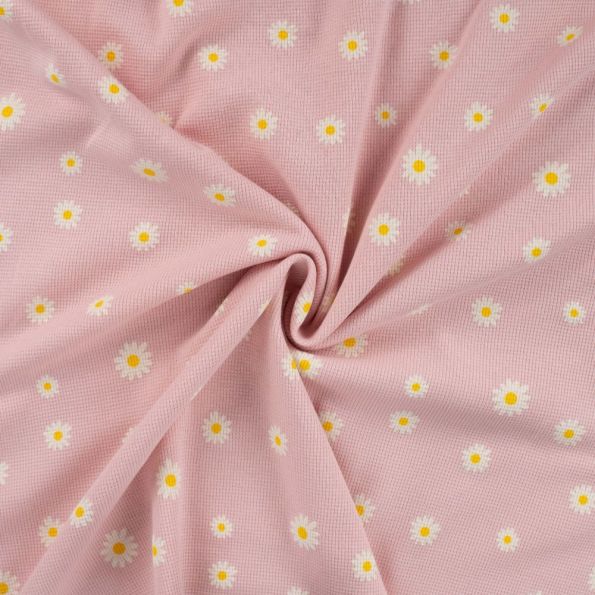 Tissu Jersey Nid d'abeille imprimé Marguerites sur fond Rose bébé - Par 10 cm