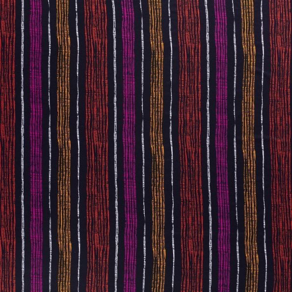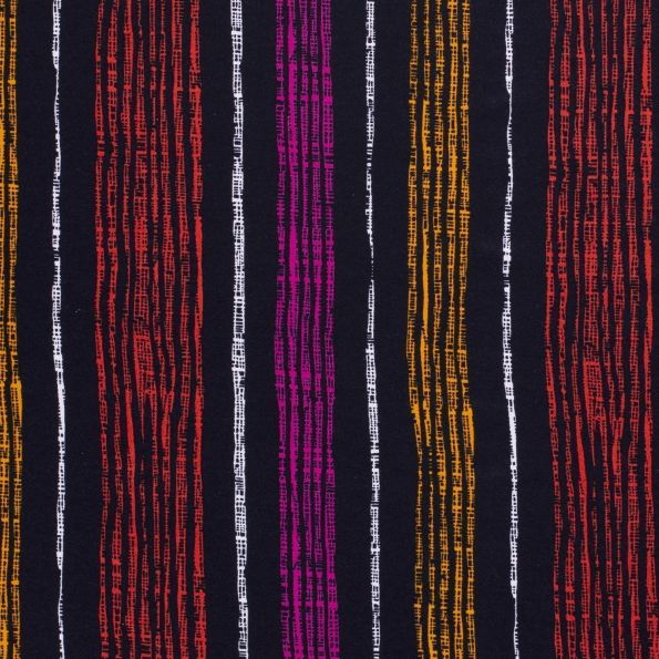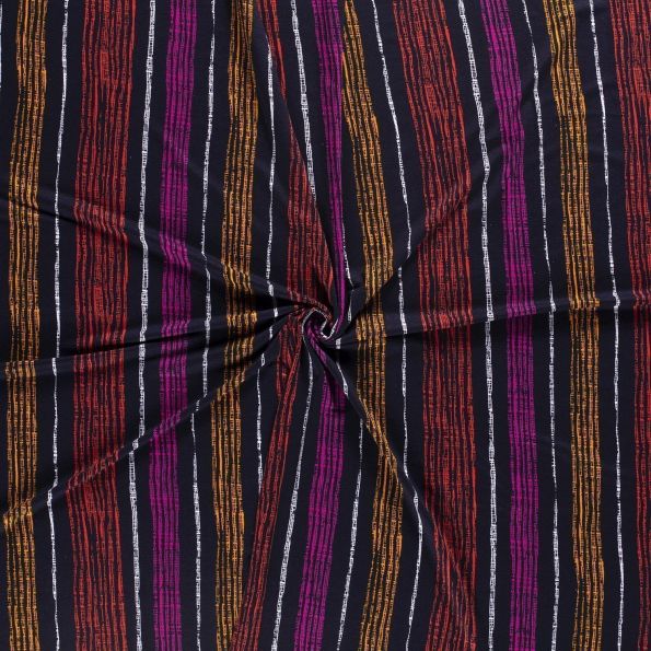 Tissu Jersey Viscose avec aspect crêpe Rayures colorés sur fond Noir - Par 10 cm