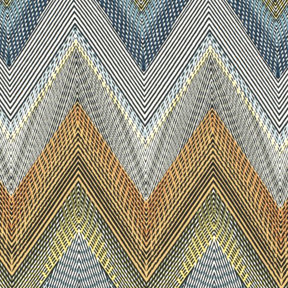 Tissu Jersey Viscose imprimé Zig zag jaune et bleu sur fond Blanc - Par 10 cm