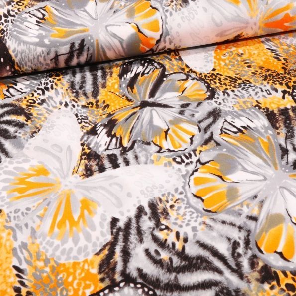 Tissu Jersey Viscose Papillons zébrés sur fond Jaune - Par 10 cm