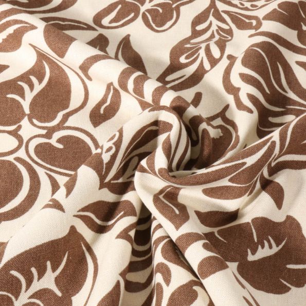 Tissu Lin Viscose Feuilles exotiques marrons sur fond Beige - Par 10 cm