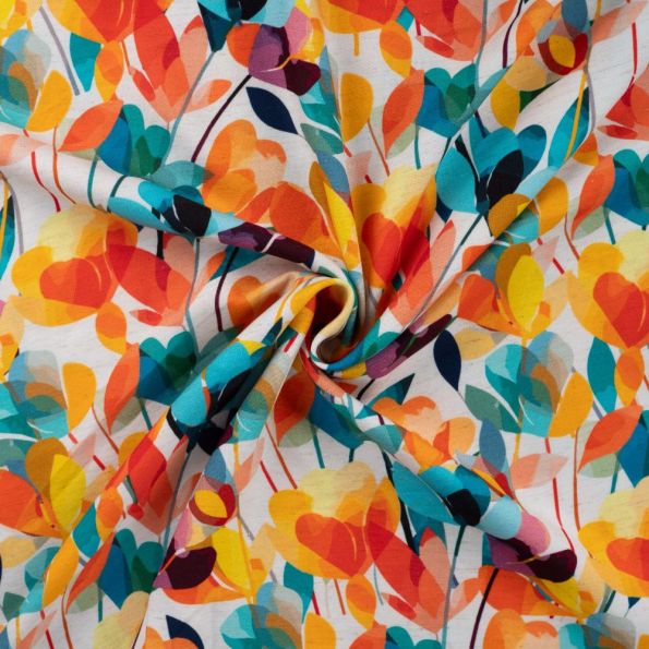 Tissu Lin Viscose impression fleuris multico sur fond Blanc - Par 10 cm