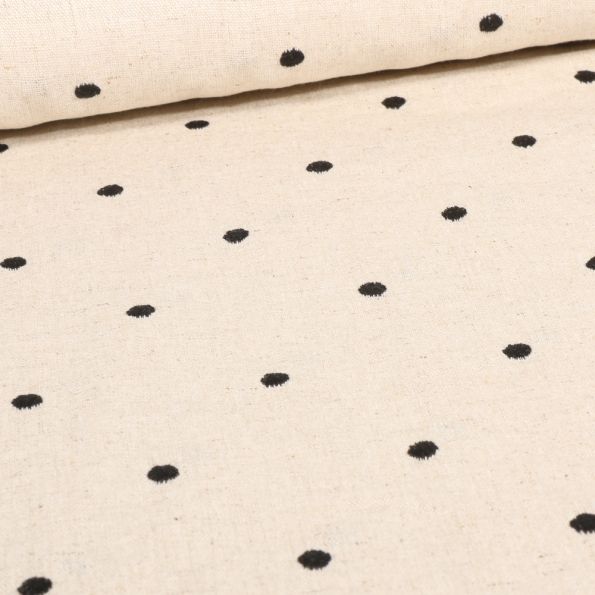 Tissu Lin Viscose Pois brodés noir sur fond Naturel - Par 10 cm
