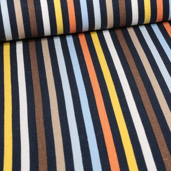 Tissu Lin Viscose Rayures multicolores sur fond Bleu marine - Par 10 cm