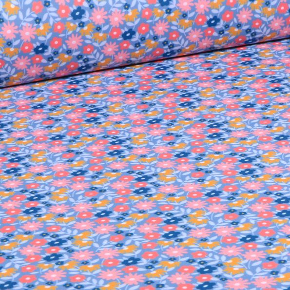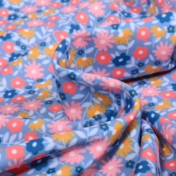 Tissu Lycra maillot de bain Flores multico sur fond Bleu ciel - Par 10 cm
