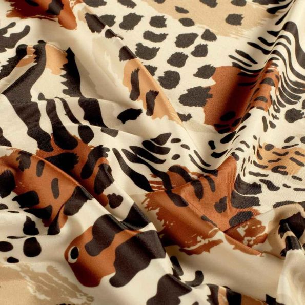 Affirmez votre style sauvage avec Noma, un tissu Lycra au motif animalier fauve sur fond beige. Ce mix graphique de zébrures, taches de léopard et marques abstraites crée un look résolument jungle urbaine, aussi audacieux que moderne. Grâce à sa composition en 82% polyester et 18% élasthanne, Noma offre un excellent confort, une belle extensibilité et un tombé fluide. Parfait pour des pièces près du corps, streetwear chic ou créations sportives tendance.