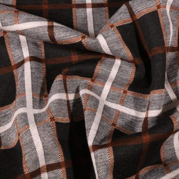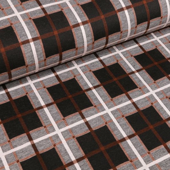 Tissu Maille Jersey Carreaux et carré ocre sur fond Gris chiné - Par 10 cm
