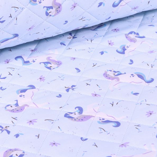 Tissu Matelassé Licornes et petites fleurs sur fond Bleu - Par 10 cm