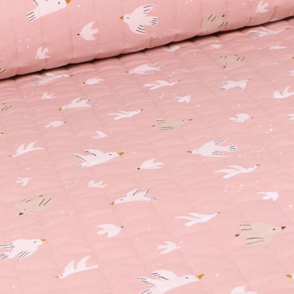 Tissu Matelassé Oiseaux sur fond Rose - Par 10 cm