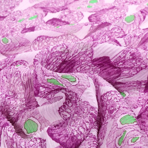 Tissu Mousseline plissé Papillons violets sur fond Blanc - Par 10 cm