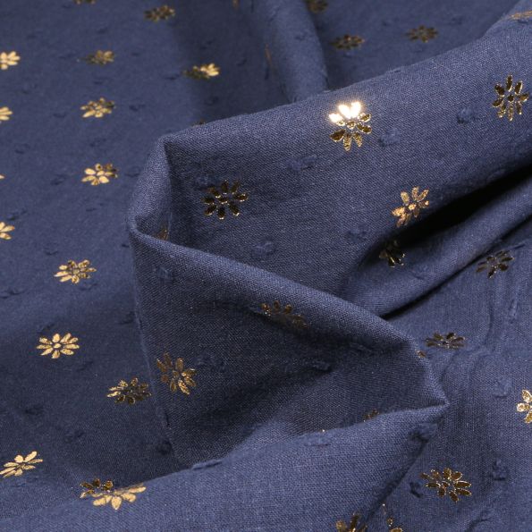 Tissu Plumetis Coton Pâquerettes métallisé doré sur fond Bleu marine - Par 10 cm