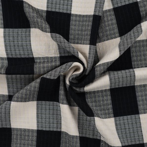 Ce tissu est composé de 65% viscose, 33% polyester et 2% élasthanne. Légèrement gaufré il offre la polyvalence du polyester à la douceur de la viscose. Son motif de carreaux et son effet gaufré lui confèrent un aspect classique. Ce tissu est idéal pour la confection de vêtements légers, tels que des chemisiers, des blouses, des robes ou des jupes. d'accessoires, de décorations intérieures et de projets d'artisanat. Il offre à la fois style et praticité, alliant durabilité et esthétique pour une variété d'utilisations créatives.