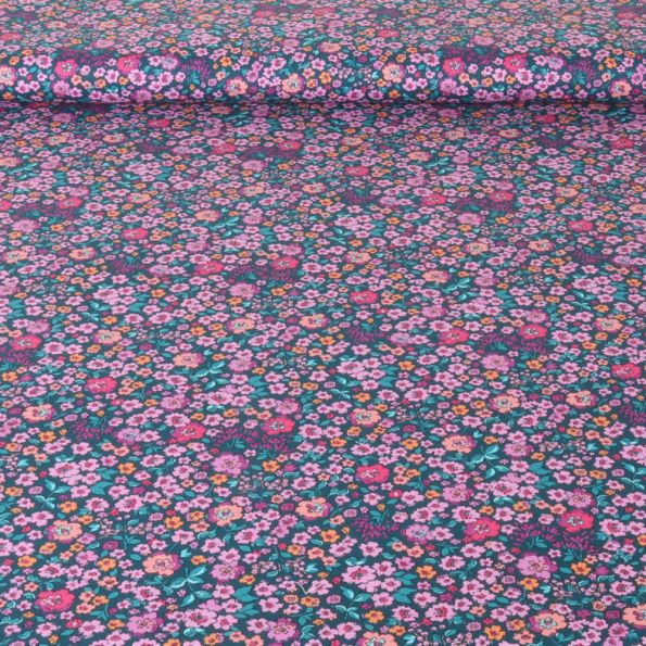 Tissu Popeline de Coton digital Poppy Fleurs roses et pêche sur fond Vert canard - Par 10 cm