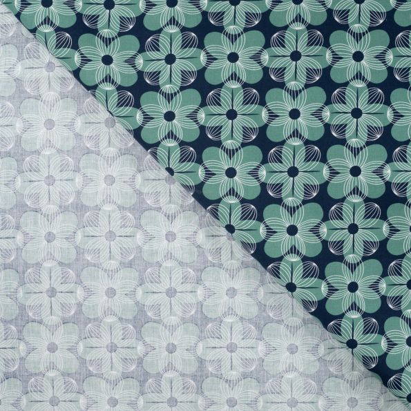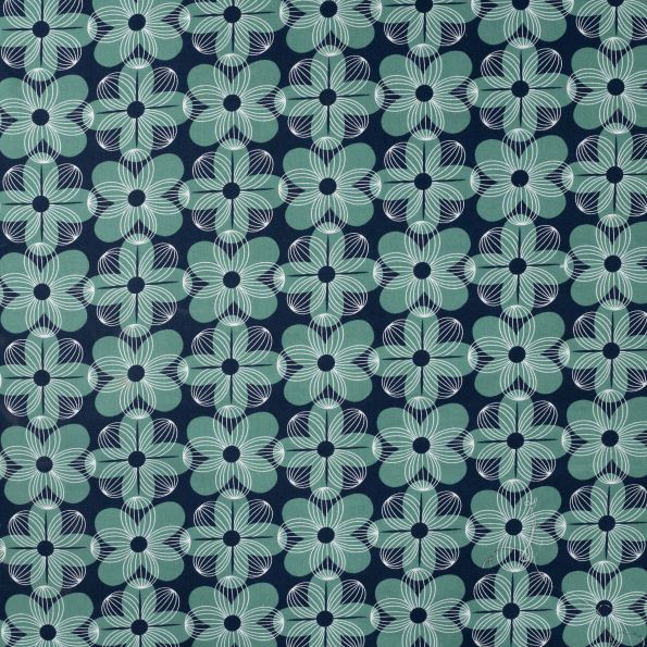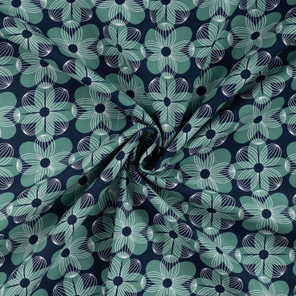 Tissu Popeline de Coton imprimé Fleuris géométrique sur fond Bleu marine - Par 10 cm