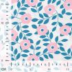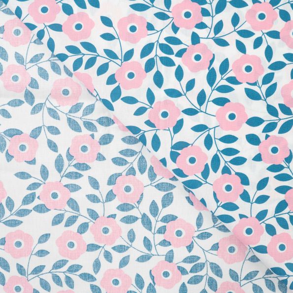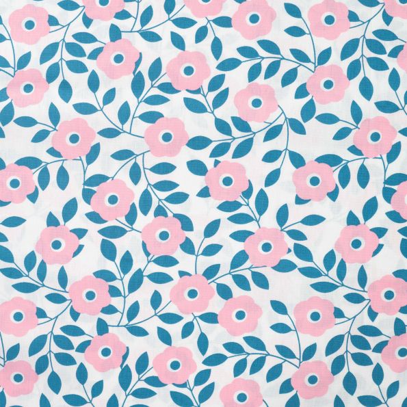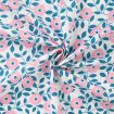 Tissu Popeline de Coton imprimé Fleuris Loulou bleu et rose sur fond Blanc - Par 10 cm