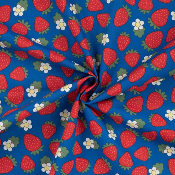 Tissu Popeline de Coton imprimé Fraises sur fond Bleu roi - Par 10 cm