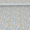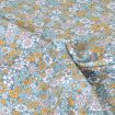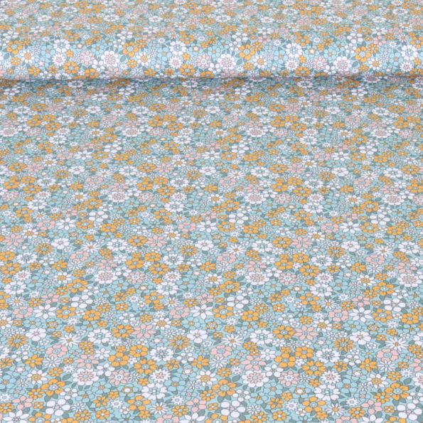 Tissu Popeline de Coton Petites fleurs jaunes, roses et blanches sur fond Bleu pétrole - Par 10 cm