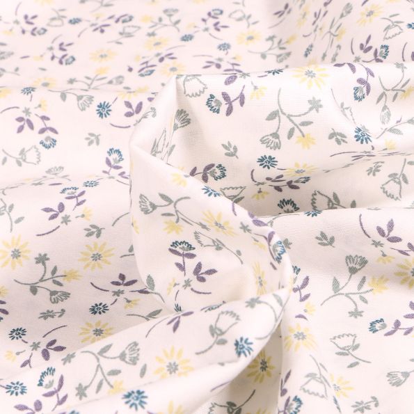 Tissu Popeline de coton Sweet Flower Fleur Lucie Vert sur fond Blanc - Par 10 cm