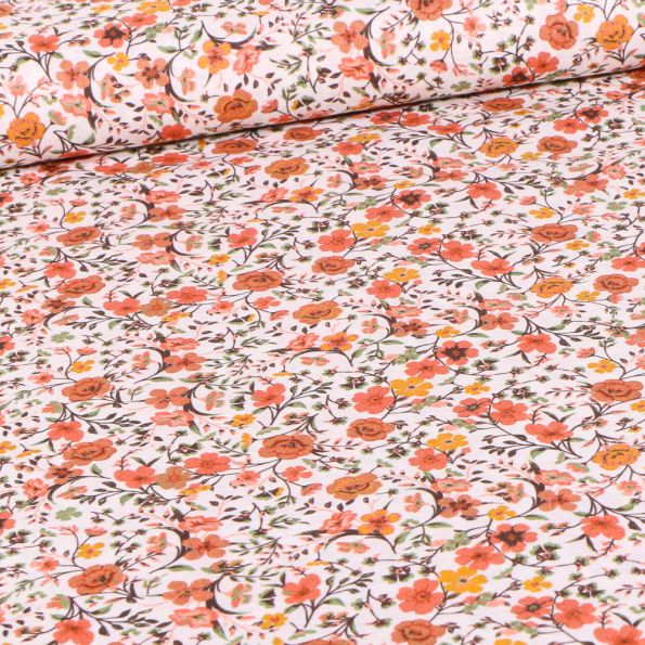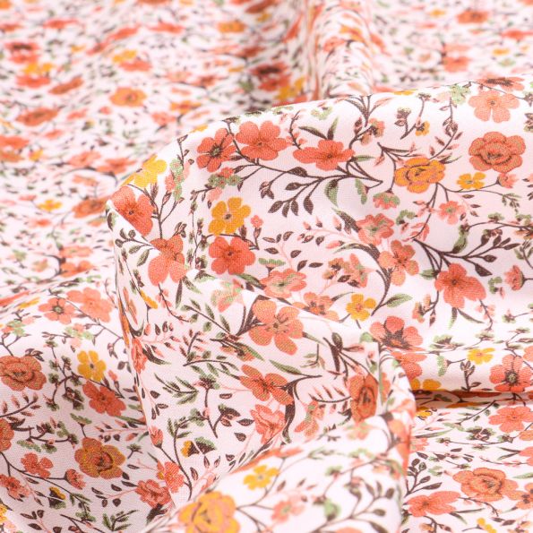 Tissu Popeline de coton Sweet Flower Mathilde Orange sur fond Blanc - Par 10 cm