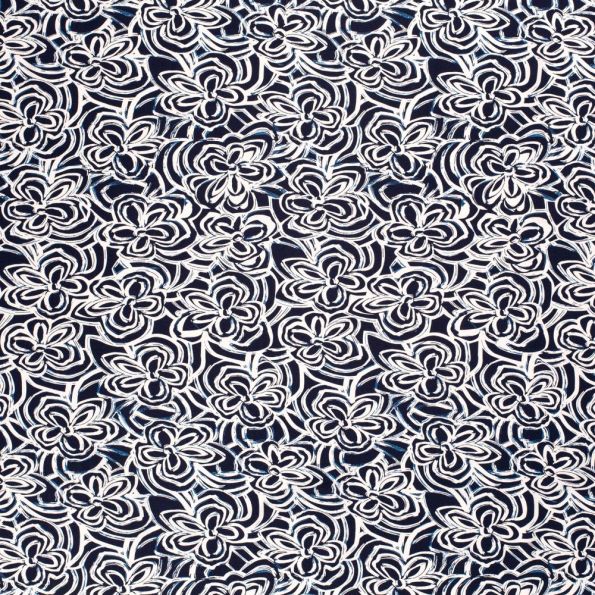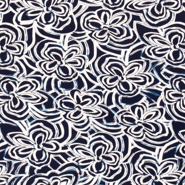 Tissu Popeline de Viscose Fleurs dessinées sur fond Bleu marine - Par 10 cm