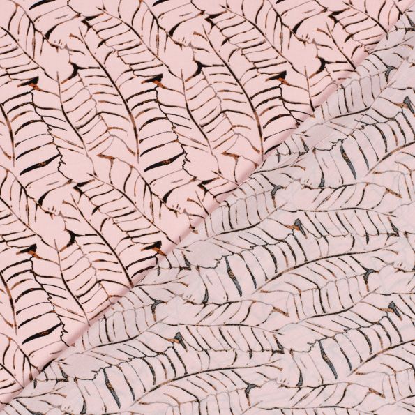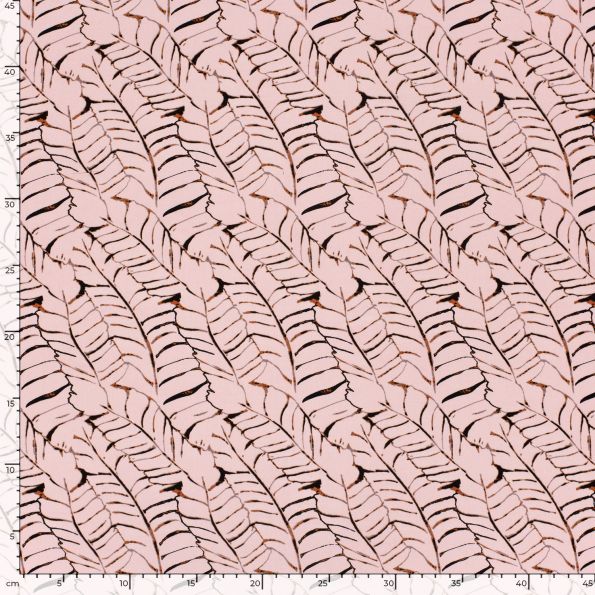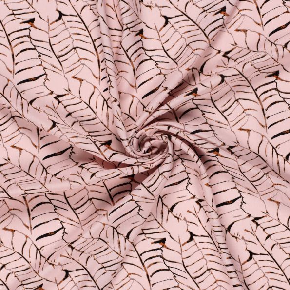 Tissu Popeline de Viscose imprimé Feuilles noires sur fond Rose - Par 10 cm