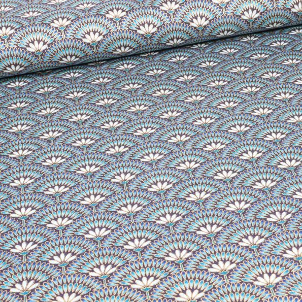 Tissu Robert Kaufman Persis Peacock éventails sur fond Bleu acier - Par 10 cm