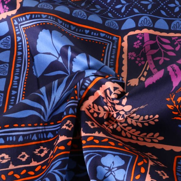 Tissu Satin de Coton imprimé Patchwork bohème floral sur fond Bleu marine - Par 10 cm