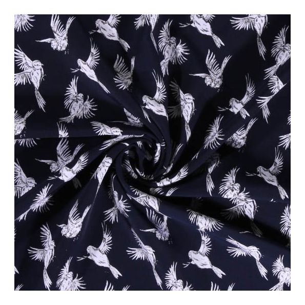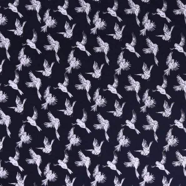 Tissu satin imprimé Oiseaux noirs et blancs en vol sur fond Bleu marine - Par 10 cm