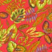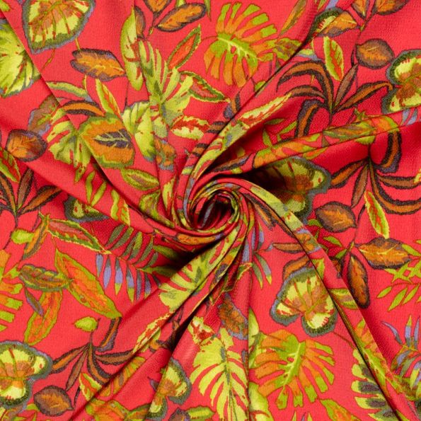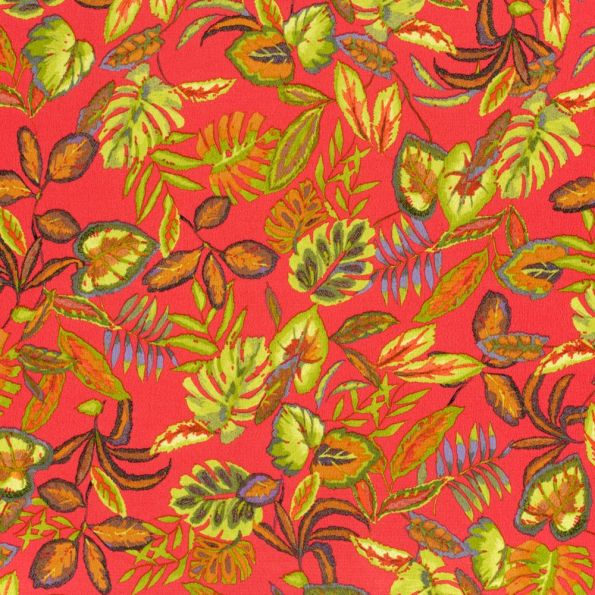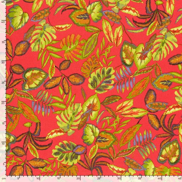 Tissu Satiné bubble Feuilles vertes sur fond Rouge - Par 10 cm