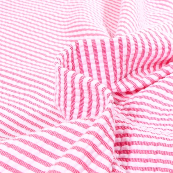 Ce tissu Seersucker à rayures très tendance est un tissu avec un aspect gaufré et aérien. Il est idéal pour confectionner des vêtements légers et agréables à porter comme des tops, chemises, shorts, tuniques, robes.