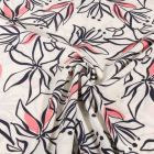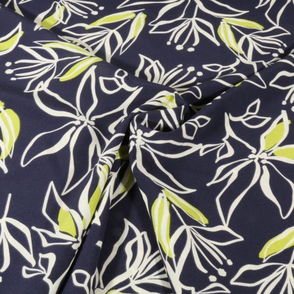 Tissu Stretch imprimé Motifs floraux blanc et vert sur fond Bleu marine - Par 10 cm