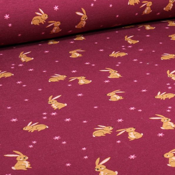 Tissu Sweat envers molletonné Bunny cute sur fond Bordeaux - Par 10 cm