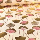 Tissu Toile Coton Feuilles Gingko dorés et bleues sur fond Naturel - Par 10 cm