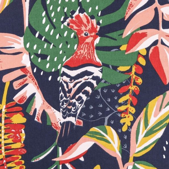 Tissu Toile Coton Huppe et décor tropical multicolores sur fond Marine - Par 10 cm