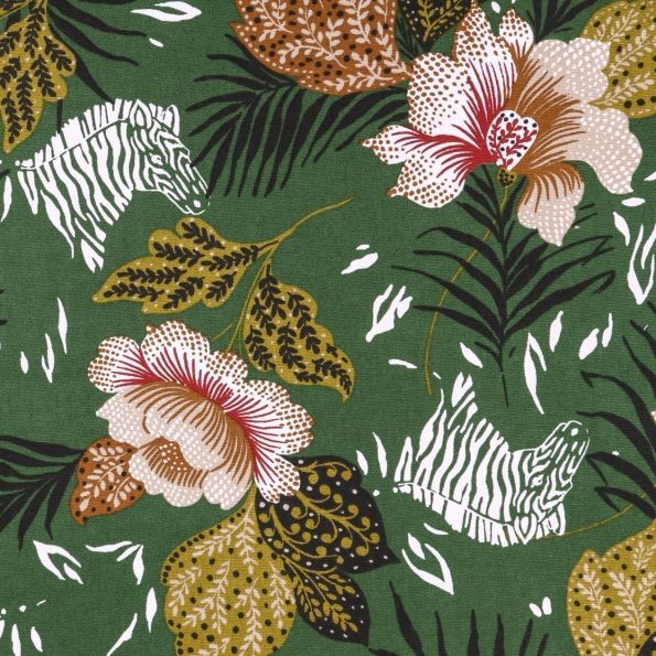 Tissu Toile Coton Zèbres et fleurs tropicales multicolores sur fond Vert foncé - Par 10 cm
