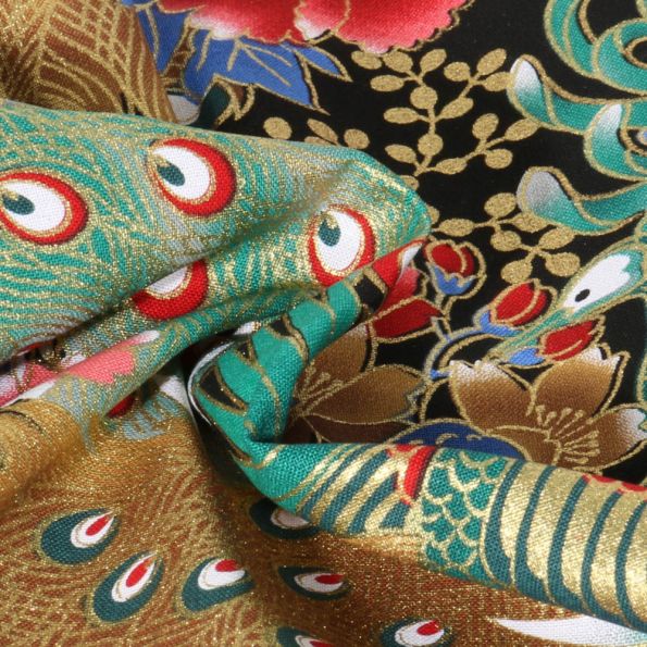 Plongez dans l’univers opulent de ce tissu en toile de coton, orné d’un somptueux motif de paons, plumes et fleurs stylisées, relevé de détails dorés métallisés. Le fond noir intense met en valeur des couleurs éclatantes : vert émeraude, rouge carmin, bleu roi et or, pour un rendu aussi précieux qu’artistique. Avec sa composition 100 % coton, sa laize de 145 cm et son poids de 185 g/m², ce tissu offre une bonne tenue, parfaite pour des vêtements structurés, vestes, jupes, kimono, sacs, accessoires de mode ou de décoration intérieure. L’imprimé raffiné en fait un choix idéal pour créer des pièces originales à l’inspiration asiatique chic ou festive.
