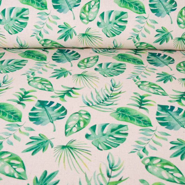 Tissu Toile de Coton aspect lin feuilles de monstera sur fond Naturel - Par 10 cm