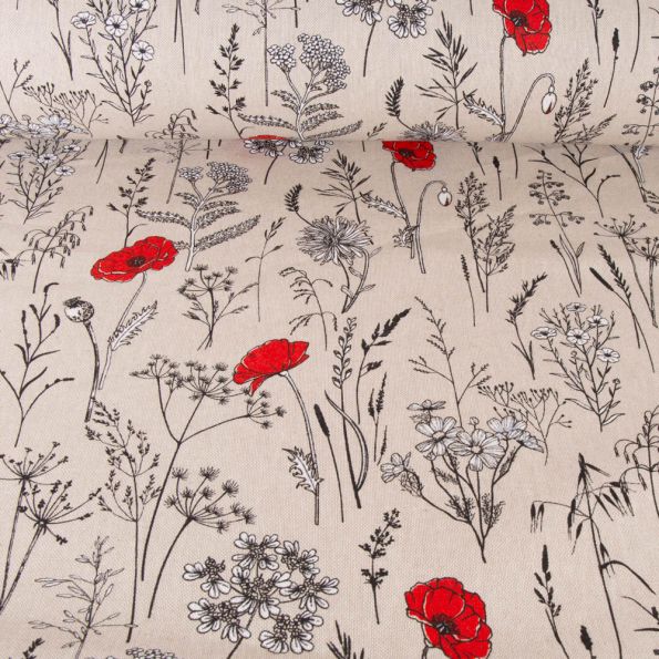 Tissu Toile de Coton aspect lin Plantes et fleurs coquelicot sur fond Beige - Par 10 cm