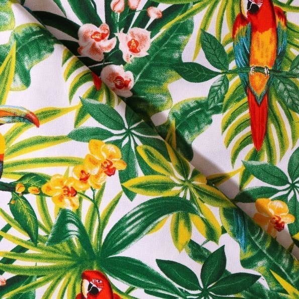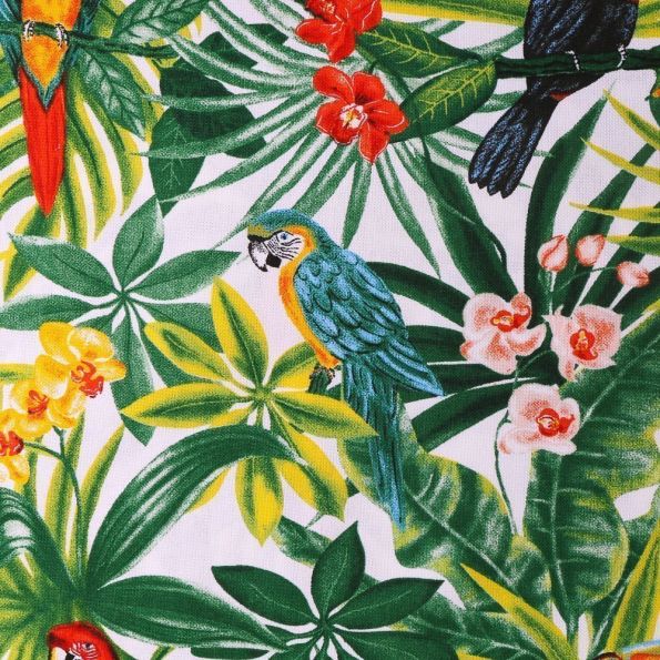 Tissu Toile de coton Grande Laize Exotique Multicolore sur fond Blanc - Par 10 cm