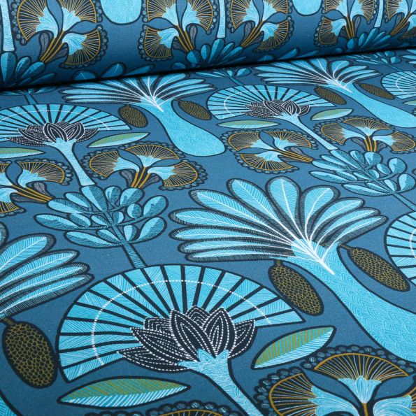 Tissu Toile de Coton Jardin enchanté sur fond Bleu - Par 10 cm