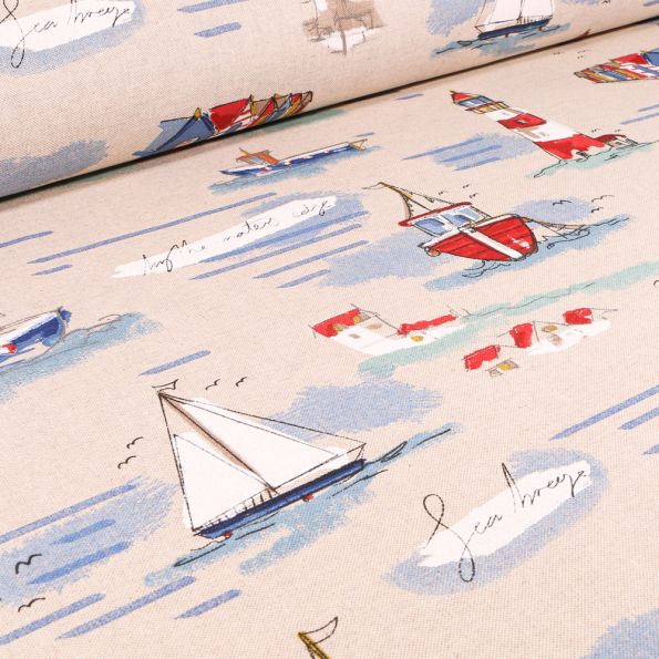 Tissu Toile de Coton Motifs peintures bord de mer sur fond Naturel - Par 10 cm