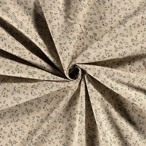 Tissu Toile de Coton Petites feuilles vertes sur fond Naturel - Par 10 cm