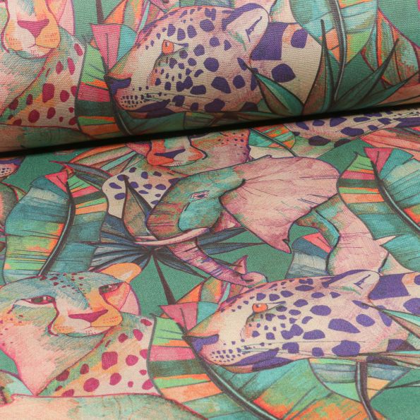 Tissu Toile Transat Dralon Têtes d'animaux sur fond Vert - Par 10 cm
