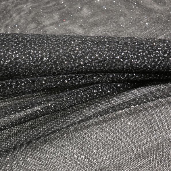 Tissu Tulle Strass Paillettes Argent sur fond Noir - Par 10 cm