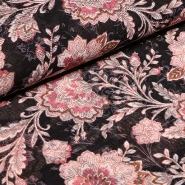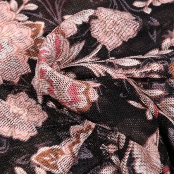 Tissu Tulle Stretch imprimé Fleuris rose poudré sur fond Noir - Par 10 cm