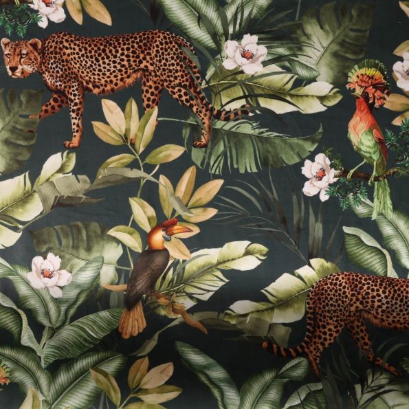 Tissu velours d'ameublement Léopard oiseaux et feuilles tropical sur fond Vert foncé - Par 10 cm